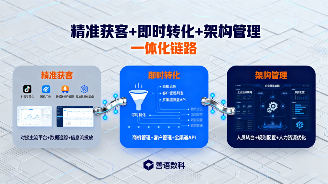 善语数科构建的全渠道流量整合体系,善语数科构建的全渠道流量整合体系,以助贷行业场景深度为核心,形成精准获客+即时转化+架构管理一体化闭环,区别于市面上现有的一些通用型投放系统偏重广告投放的模式。